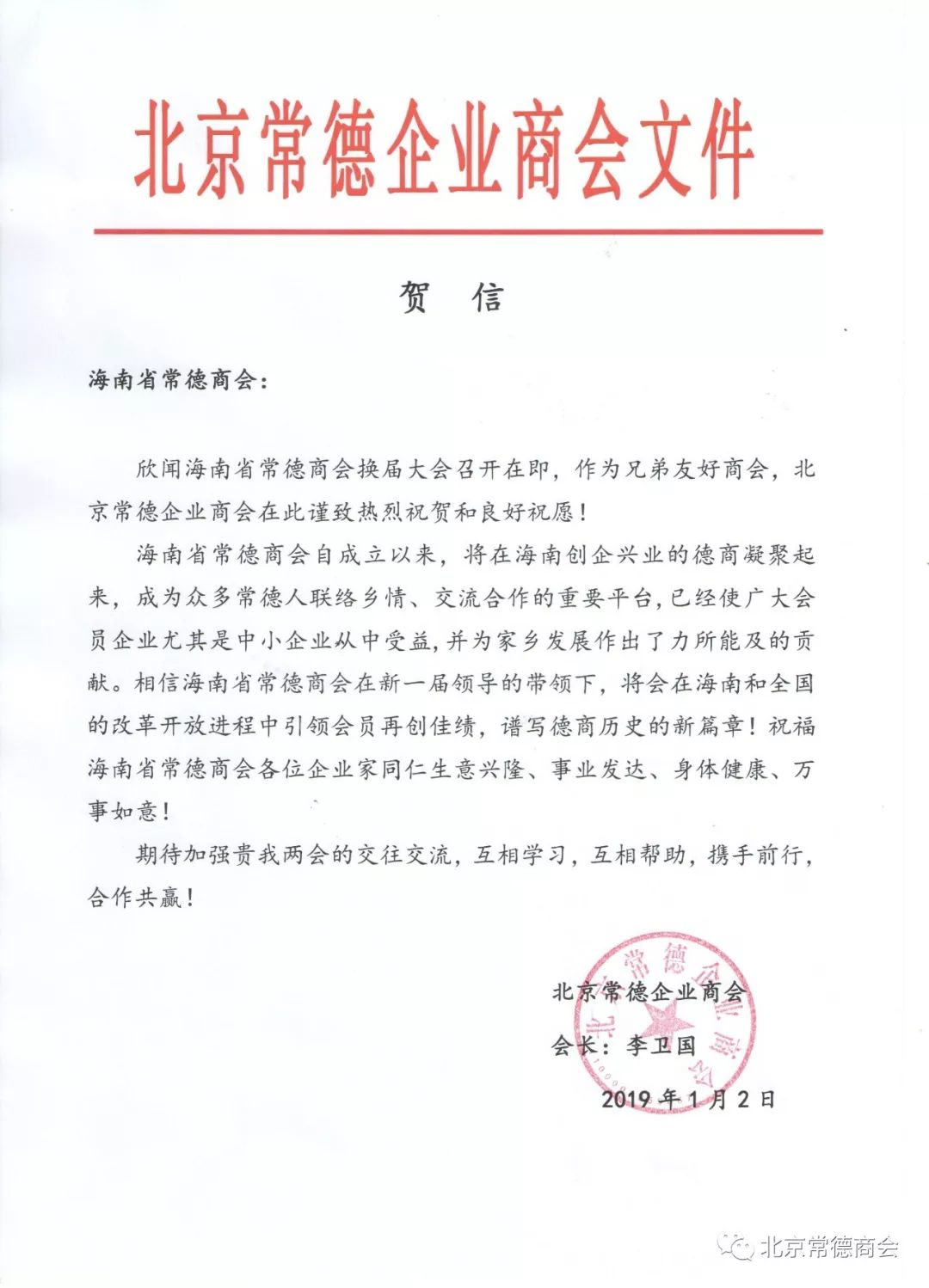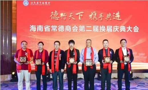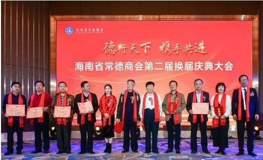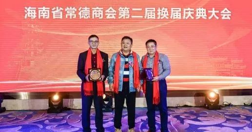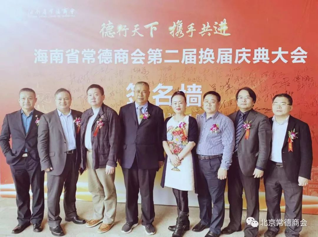 编者按: 2019年1月8日下午,海南省常德商会第二届会员代表大会暨换届庆典在海口市新埠岛诺富特酒店隆重举行。本次大会邀请了在琼常德籍部分老领导、湖南省政府及常德市政府驻海南办事处、常德市工商联、海南省民政厅、海南省工商联等单位负责人及异地商会代表和各界嘉宾三百余人出席。北京常德企业商会轮值常务副会长万绍英、常务副会长陈本安,副会长兼秘书长李轩,副会长孙松柏、贺杰等应邀出席了大会,并代表商会对海南常德商会新当选的曹成伟会长、王思政等执行会长、尹一冰等副会长、熊国华秘书长等当选负责人表示热烈祝贺。李卫国会长此前安排秘书处发去了贺信,万绍英常务副会长和周元法监事长(因事未能到会)还分别代表商会向海南常德商会赠送墨宝一幅,祝愿两地商会携手前行。