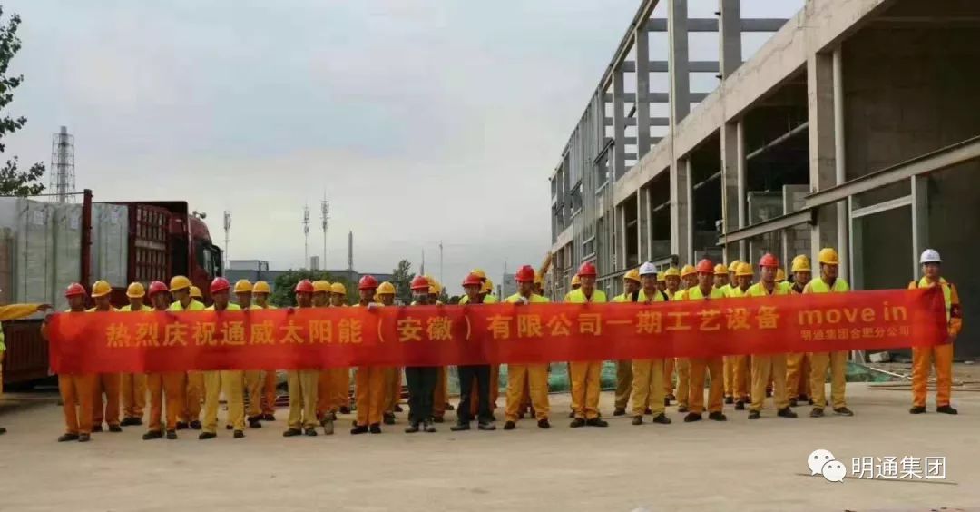 2018年10月,通威太阳能(安徽)有限公司一期工艺设备MOVE IN仪式在其合肥生产工厂隆重举行,标志代表着中国太阳能生产设备先进水平的首台精密设备成功搬入,明通项目团队不负众望,以扎实的项目管理能力,为客户提供了满意的服务。