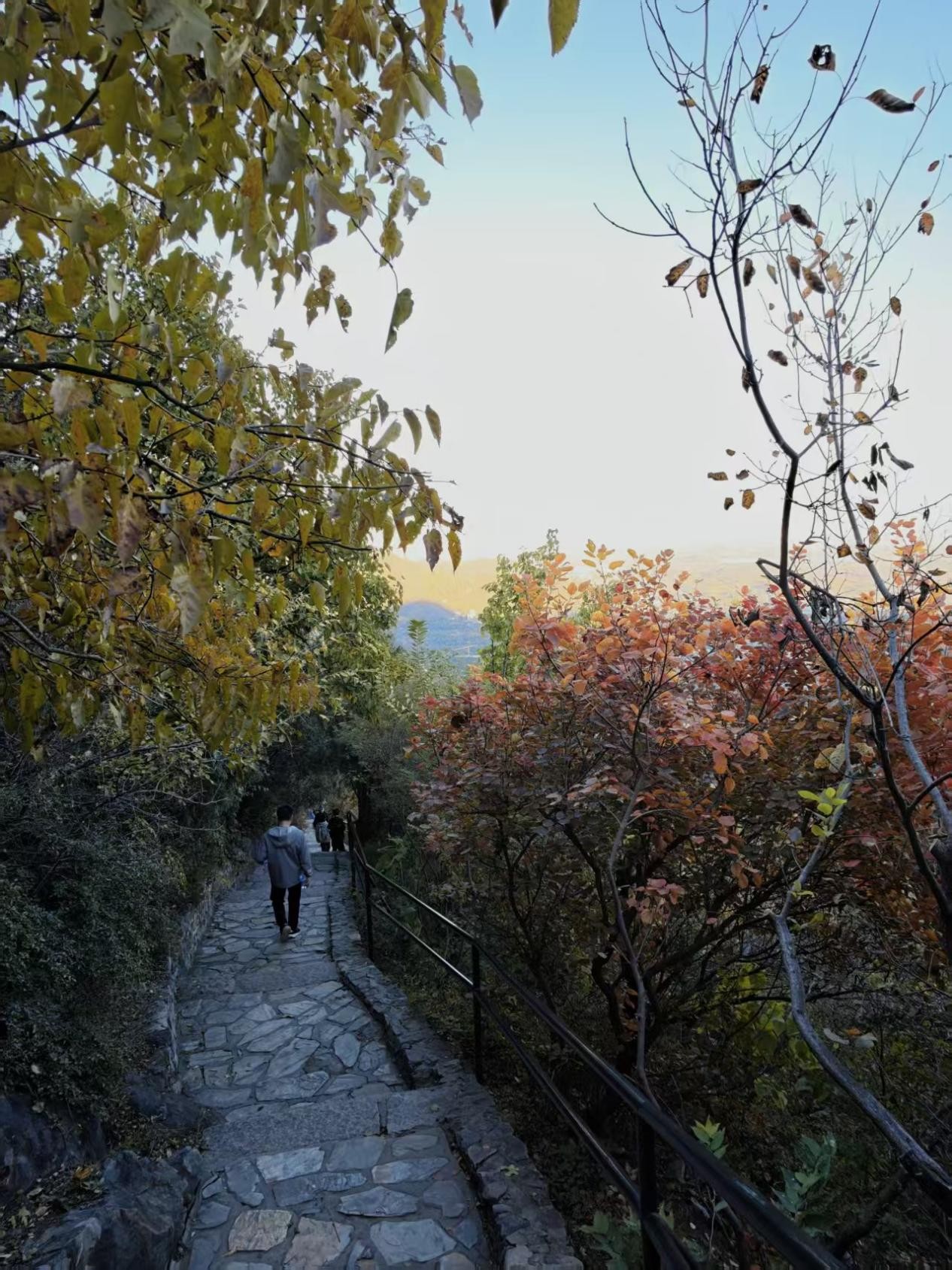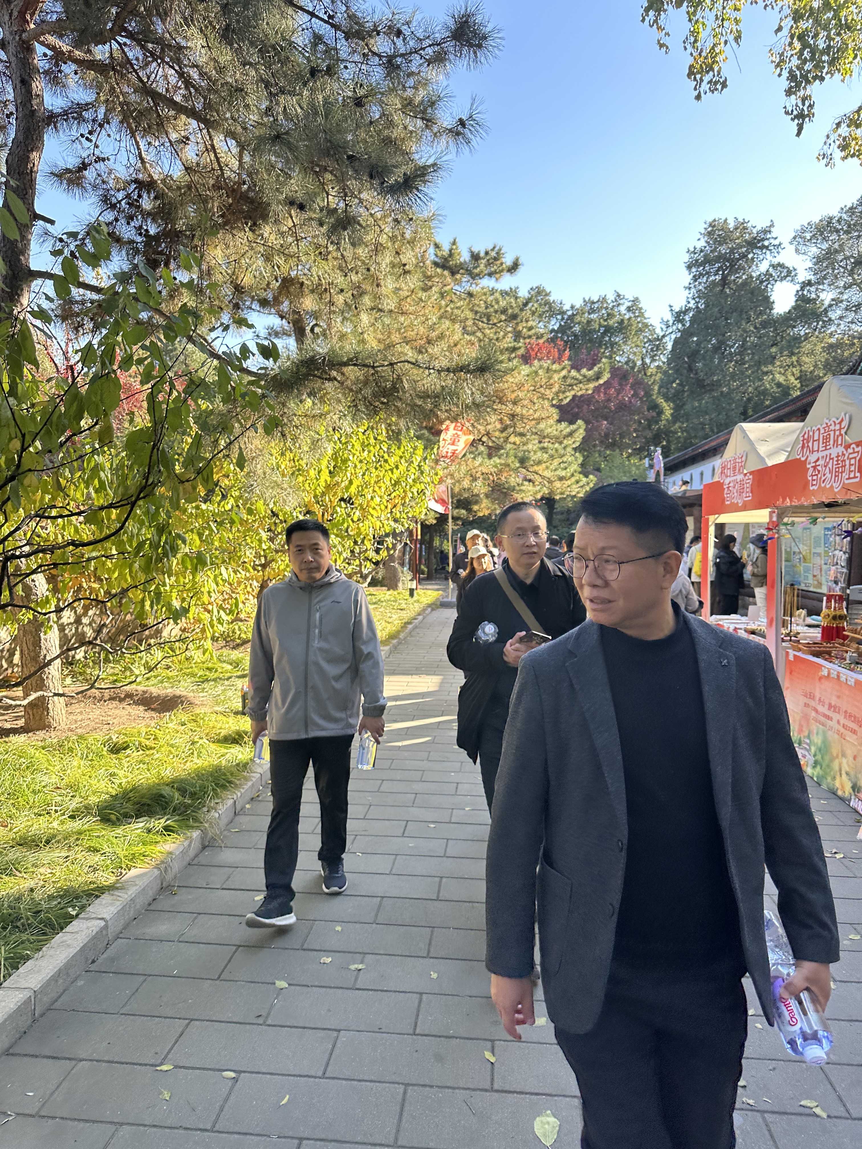 行至半山亭,凭栏远眺。漫山遍野的红叶,在阳光下燃烧着层次丰富的暖意,从橘红到赭褐,如一片无声的、壮丽的烽火,我们走走停停,共享这片刻的辉煌。这景致不属于我们任何一个人,却仿佛专为我们这一群人而设。它让我们暂时忘却了报表与合约,只在自然的宏大与静美中,确认彼此为同路之人。
